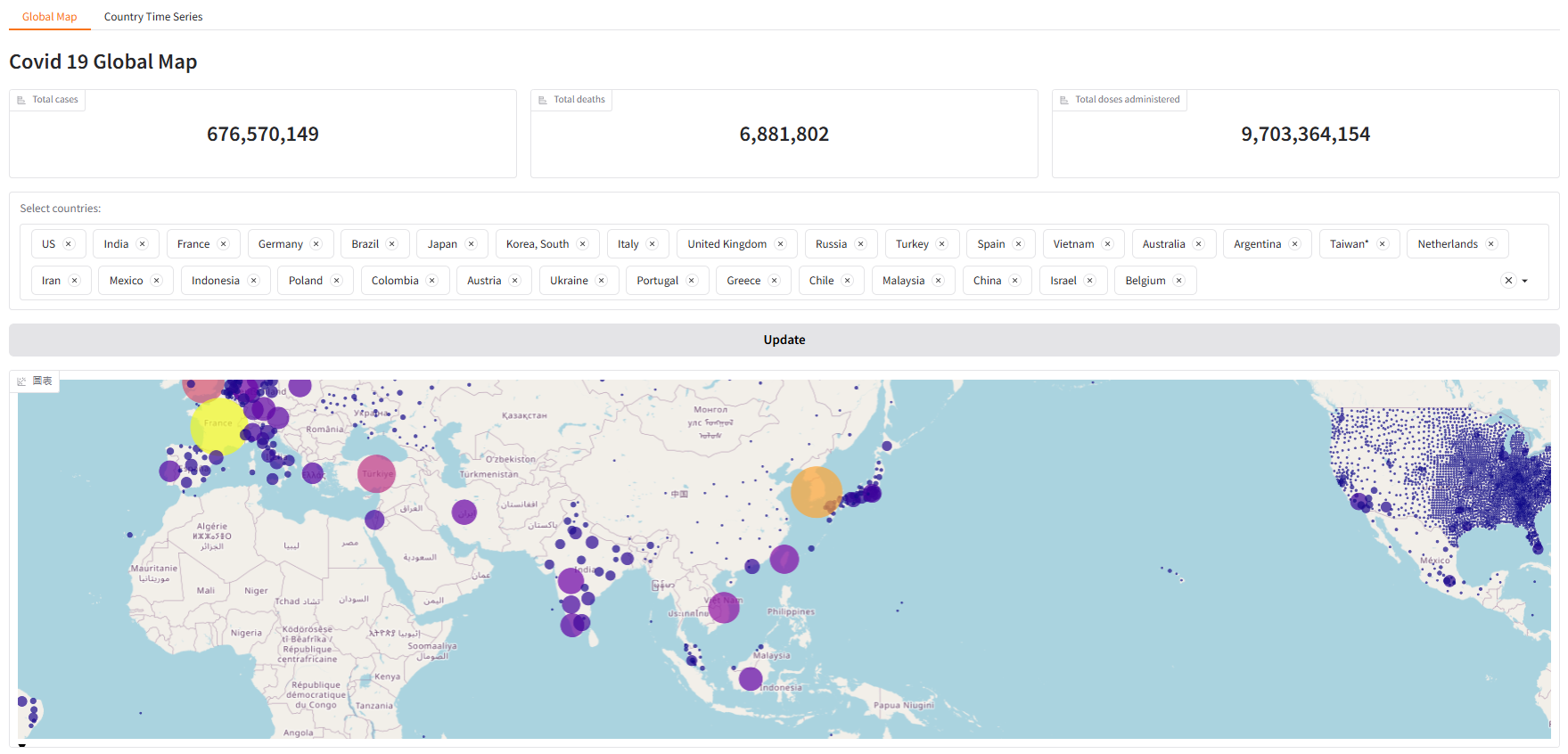 地圖頁面:新增細節確診數、死亡數、疫苗數統計資料、篩選清單(預設為確診數前 30 國家) 與 更新按鈕。